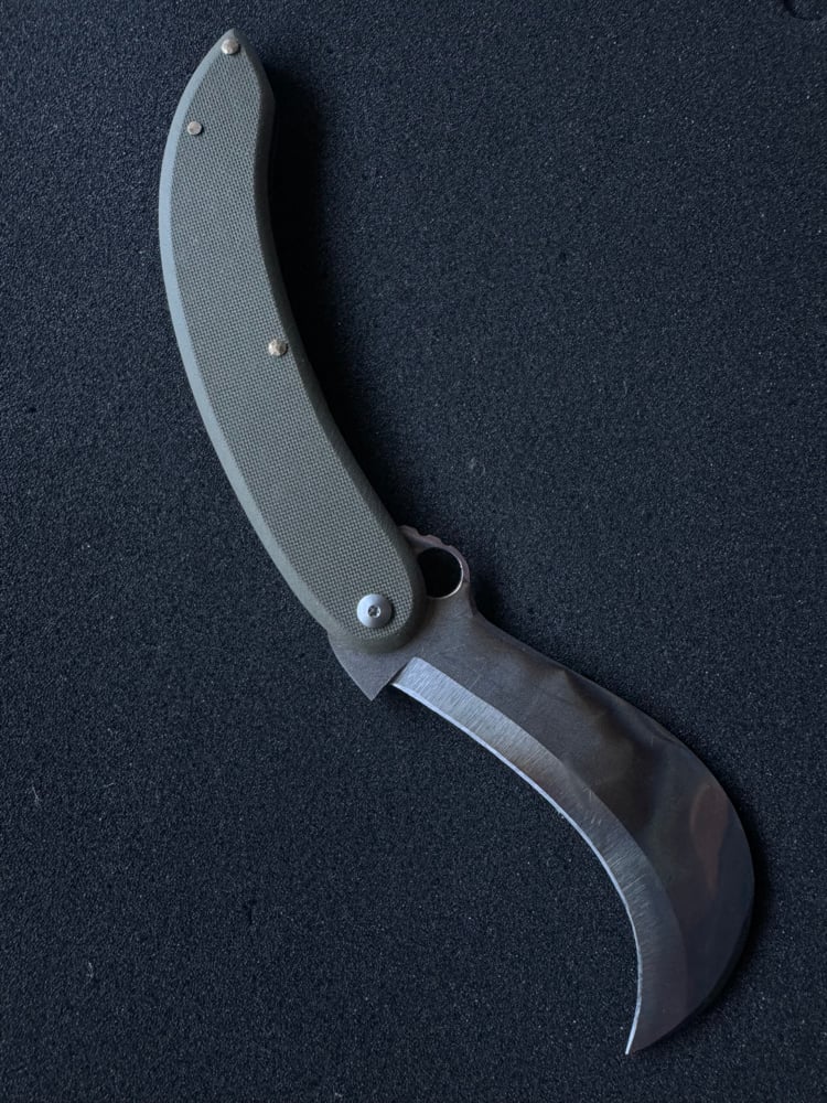 The OG (saca tripas) is a one of my initial designs. Large, robust and made for large hands. Made with aebl stainless steel blade, OD/Olive green textured g10 scales with stainless steel pivot and brass pins.